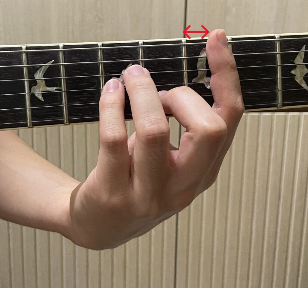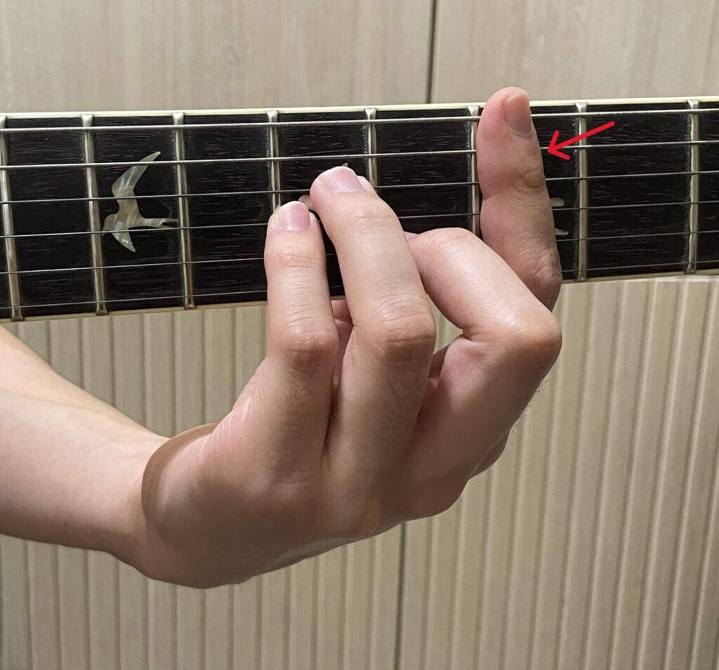 就像平時按單音一樣,我們應該在最靠近Fret的位置施加壓力。雖然看上去食指好像在Fret上面,但謹記不要按在上面。