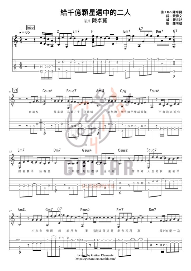 [Tab譜/琴譜] Ian 陳卓賢-給千億顆星選中的二人