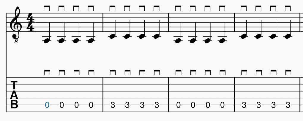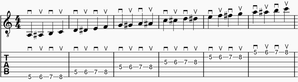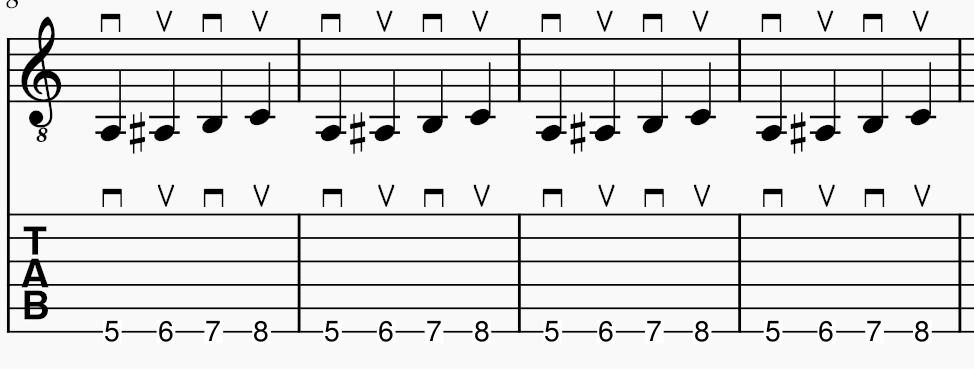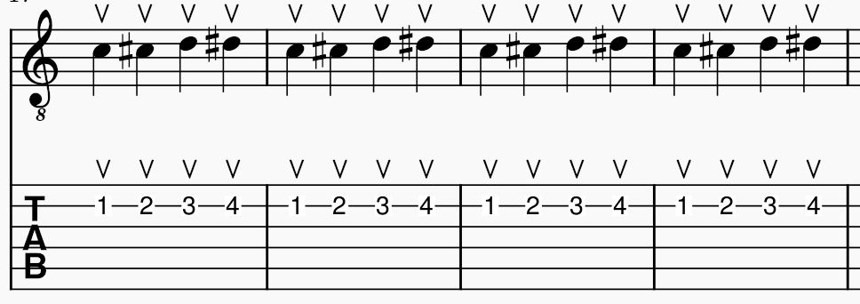 這個練習我們全都會用Down Pick,最佳方法是跟著拍子機練習。我們可以由50bpm開始,循序漸進。