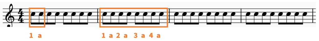 由於它的時值是四分音符的一半,所以數的時候不可以只用One,Two,Three,Four,於是我們會加入「and」,或是「a」這樣的簡寫,如下圖: