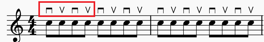另外,有時候我們會在樂譜上看到以下的符號,其實這是提示結他手應該往上還是往下掃。顧名思義,開口向下的是往下掃,開口向上的則是往上掃的意思。