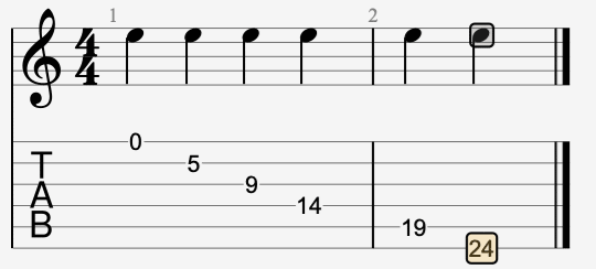 上面是最簡單的例子,在五線譜上的同一個音(E),其實可以在結他的不同線不同格數找到,所以Tab譜能給初學者最快捷準確的資訊。